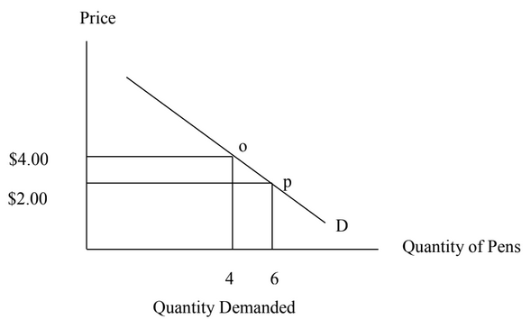 There is an inverse relationship between price and quantity demanded. As price increases, caeteris paribus, quantity demanded for a product will fall; likewise, when the price decreases, quantity demanded for the product will rise. This is what is referred to as the law of demand. Quantity demanded in influenced by the price and the price only and it is reflected as a movement along the demand curve only; not a shift of the entire demand curve. For example, as shown in the following graph, if the price of pens decreases from $4.00 to $2.00, quantity demanded will increase from 4 pens to 6 pens and this will be depicted as a movement along the demand curve from point o to point p.