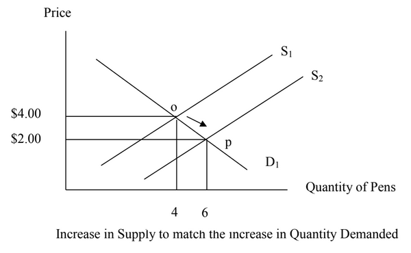 As stated earlier, demand is the willingness and ability of consumers to pay for their wants and needs. In response to this increase in quantity demanded, supply will now have to increase in order to facilitate the increase in quantity demanded. Supply curve now shifts from S1 to S2 as in the following graph.