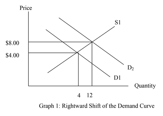 Income – when income of persons increases, caeteris paribus, their ability to purchase a particular good will increase and the demand for that good will increase. Therefore, its demand curve will shift to the right from D1 to D2 as in Graph 1. As a result, price increases from $4.00 to $8.00 and demand increases from 4 units to 12 units.