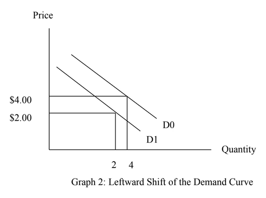 Price of Complement goods – when the price of complement good increases, ceteris paribus, the demand for the good in consideration will fall because both goods go together. The demand curve for the good in consideration will shift to the left from D0 to D1 resulting in demand falling from 4 units to 2 units and price falling from $4.00 to $2.00 as shown in Graph 2.